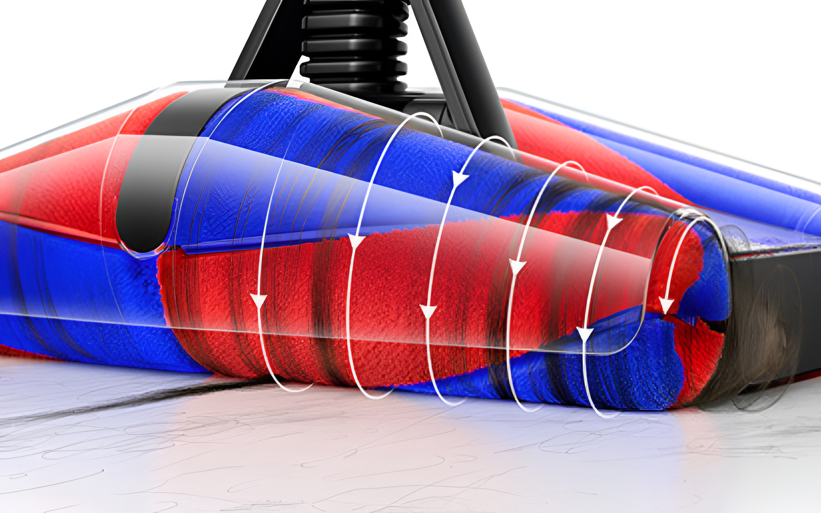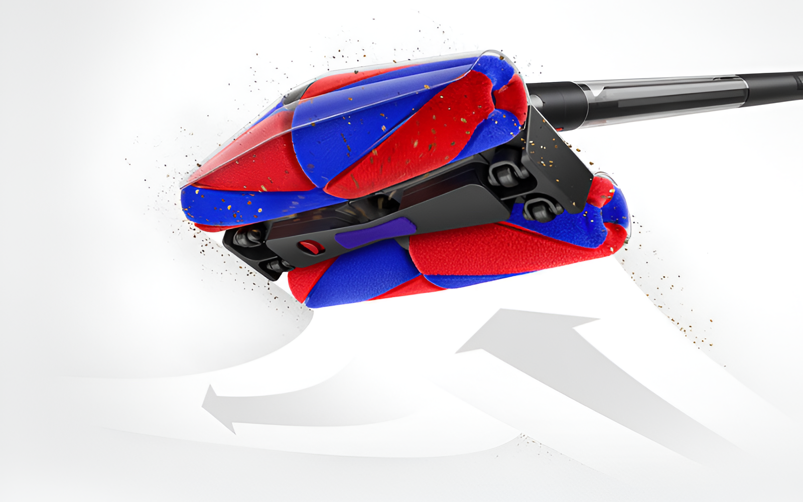 - Κεφαλή καθαρισμού Fluffycones™ με τέσσερις αντίθετα περιστρεφόμενες κωνικές ράβδους καθαρισμού Fluffy™ που αφαιρούν σκόνη, υπολείμματα και τρίχες από σκληρά δάπεδα - χωρίς να μπερδεύονται στην κεφαλή καθαρισμού